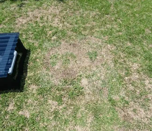 • Malla/mesh fijada: malla de jardín o tipo «hardware cloth» para que la rueda no pueda cavar. (Ojo: algunas mallas cortan el césped si son demasiado agresivas; mejor probar con rejilla pensada para césped o con goma).